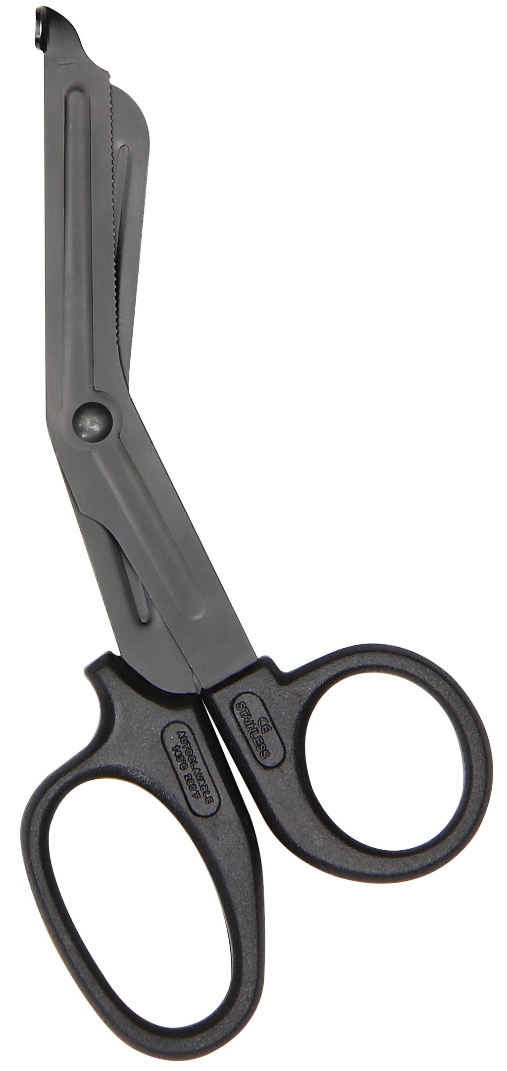 5.75" Stainless Steel Bandage Sheers with black handle and black blade used for cutting tape or bandages. The curved blade prevents cutting the patient. Shears are ideal for EMT/EMS, paramedics, nurses, or any first aid kit.