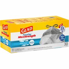 Glad ForceFlex MaxStrength X-Large Kitchen Drawstring Trash Bags Fresh Clean with Febreze Freshness - Large Size - 20 gal Capacity - 32.01" Length x 24.02" Width - Drawstring Closure - Gray - Garbage, Kitchen, Office, Home - 30/Box - 1 Each Glad ForceFlex MaxStrength X-Large Kitchen Trash Bags provide strength and Fresh Clean scent with Febreze Freshness to help your kitchen smell fresh. These 20-gallon bags are 25 percent more durable than a 20-gallon Glad ForceFlex and equipped with a twice-reinforced top compared to a standard, 20-gallon Glad kitchen bag to pull and carry, helping prevent rips at the top. It also features an outer leak protection layer and inner layer that stretches to help prevent rips and tears. OdorShield technology provides odor control to help fight smells. Bags from Glad U.S. plants are made with 100 percent renewable electricity, and all electrical energy used is offset by virtual power purchase agreements and purchased renewable energy certificates (RECs).
