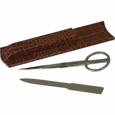 Protacini Cognac Brown Italian Patent Leather Library Set Leather, Velveteen, Brass - Brown - 1 Each Library Set features a stunning combination of Italian leather and handcrafted design to make it a showpiece that you'll be proud to feature prominently on your desk. Silver-accented scissors and letter opener are neatly stowed in a gorgeous leather holder unit that adds both function and beauty. Solid and hefty, the quality of the materials and construction are readily apparent. Unique, high-end style makes a statement of luxury in your office from day one. Leather adds a smart, sophisticated look to your space. Letter opener has a 5" blade. Scissors have 4" blades. Soft velveteen protects surfaces from scuffs and scratches.