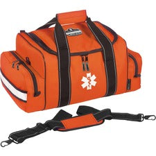 Ergodyne Arsenal 5215 Carrying Case Trauma Kit - Blue 600D Polyester Body - Reflective Stripes - 8.5" Height x 12" Width x 19" Depth - Large Size - 1 Each Arsenal 5215 Large Trauma Bag features multiple compartments to hold your trauma supplies, including splints, burn dressing, gloves, bandages and more. Customize the main hold (14" x 12" x 8-1/2") with adjustable internal dividers. Bag also includes two side pockets (2-1/2" x 12" x 5") with zippers. Reflective stripes on the front of both side pockets offer better visibility. ID card window on the back lets you load your information for easy identification. Bag is made of 600D polyester with reinforced backing. First aid supplies are not included.