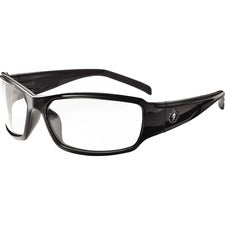 Ergodyne THOR Clear Lens Safety Glasses Eye Protection - Black - Clear Lens - Durable, Bendable Frame, Flexible Frame, Break Resistant, Non-Slip Temple, Rubber Tipped Temples, Slip Resistant, Anti-scratch, UV Resistant, Polarized, Anti-glare, ... - 1 Each Thor Clear Lens Safety Glasses feature tough, scratch-resistant lenses that filter 99.9 percent of harmful UVA, UVB and UVC rays to keep your eyes protected from the sun. Sleek, blade-style design provides a sporty look. Durable frames bend and flex without breaking. Sweat-resistant, flexible rubber temples and nonslip nose offer a comfortable fit for all-day wear. Impact-resistant glasses are tested and approved by ANSI Z87.1 plus for High Velocity Impact Protection and meet CSA Z94.3 requirements. They're also MIL-PRF 32432 approved for ballistic impact by withstanding a steel projectile shot from 660' away at 201m per second.