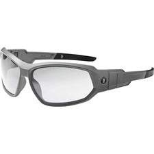 Ergodyne Loki AF Clear Safety Glasses Matte Gray Frame/Clear Lens Skullerz Loki Safety Glasses are designed to be worn as regular sunglasses or as safety goggles by removing the temples and attaching the elastic strap and removable foam gasket for a dust-beating seal (both included). Tough, scratch-resistant lens filters 99.9 percent of harmful UVA, UVB and UVC rays to keep your eyes safe in the sun. Protective, work safety sunglasses are military tested and ANSI Compliant. Clear Fog-off Lens is ideal for indoor use, low light and hazy/cloudy conditions. Permanent, anti-fog treatment delivers fog-free viewing at all times and will not wash or wear off. Durable, nylon frames bend and flex without breaking. Nonslip, rubber nose piece and rubber temples keep the glasses secure and resist sweat. Frame width is 144mm.