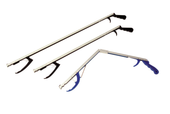Finger Trigger reaching aides available in a variety of sizes both standard and folding. These reaching aides assist individuals with limited reach and hand strength. Units have magnetic tip to help retrieve objects. Drag lug helps position product for easy pick-up. Open jaw closes when trigger is squeezed.
