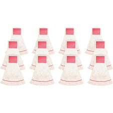Genuine Joe Synthetic Blend Large Mophead Rayon, Cotton - White - 12 / Carton Large mophead with a wide headband is ideal for general cleaning and disinfecting. Synthetic blend fibers (rayon and cotton) absorb six to seven times their weight. Mop offers a limited break-in period so you can start mopping sooner. Looped ends provide greater durability and launderability. Wide headband allows added launderability and use with all handle styles. 5" mesh headband with "S" zig-zag stitch pattern provides a more durable headband.