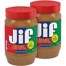 Green Rabbit Jif Creamy Peanut Butter Creamy, Peanut Butter - 2.50 lb - 2 / Carton Enjoy this 40 oz. Jif Creamy Peanut Butter for a classic pairing with jelly or as a healthy snack with veggies or fruit. Smooth, creamy peanut butter is made with fresh-roasted peanuts everyone will enjoy. It's ideal for a variety of recipes like sandwiches, backing or just eating on its own. Large 40 oz. jar contains 34 servings and 190 calories per serving. Gluten-free recipe is a good source of protein with no trans fat or cholesterol.