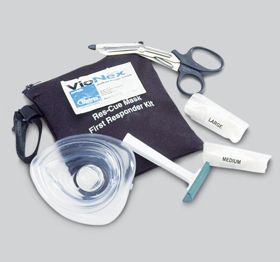 Ambu® First Responder® Kit, Full kit. Attaches to carrying case. Includes 2 sets of disposable vinyl gloves, 1 reusable mouth barrier mask with valve, 1 disposable razor, 1 disposable anti-microbial wipe, and 1 pair of trauma scissors.